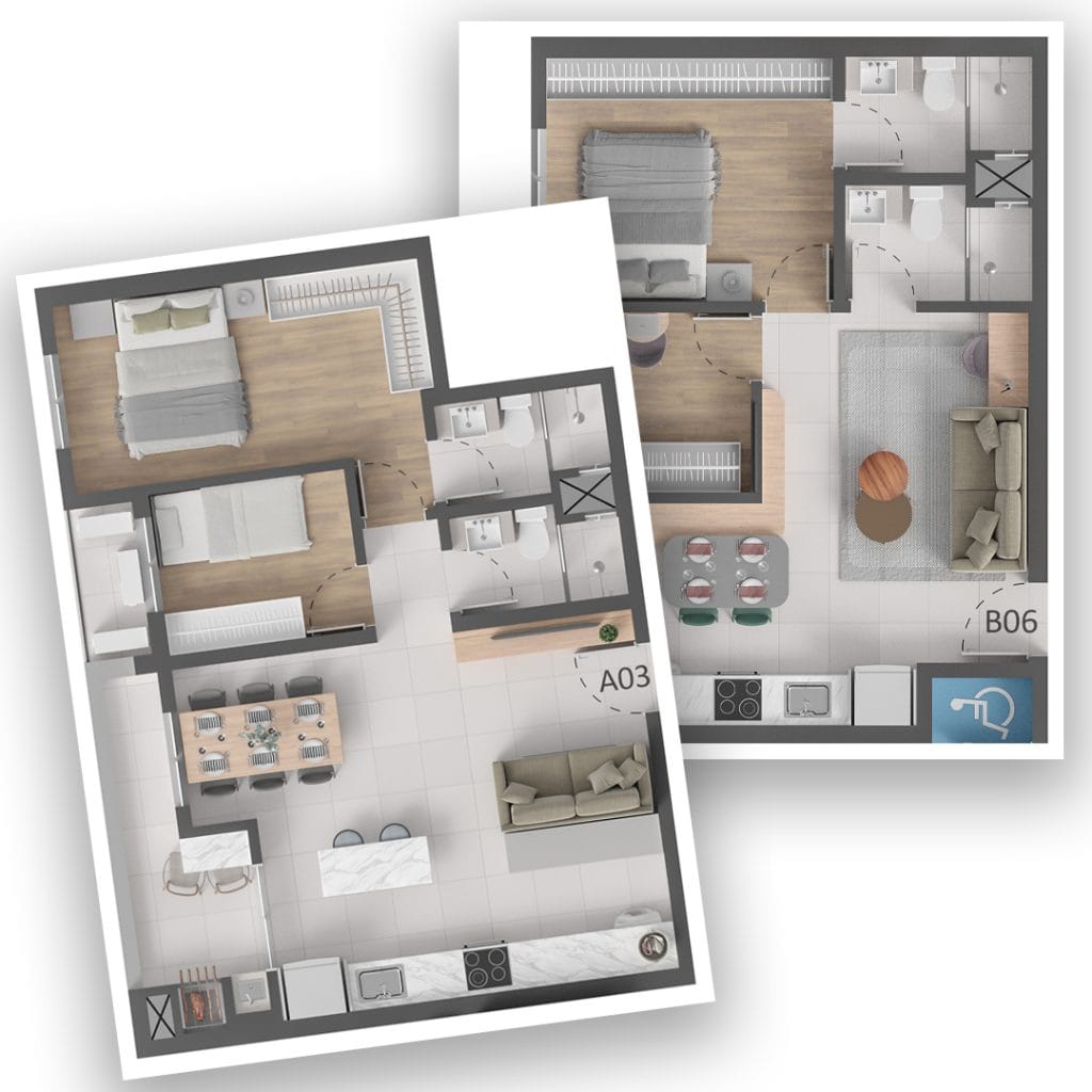 Apartamentos de 50m² à 62m² com opções de personalização. Opções também de Giardinos.
